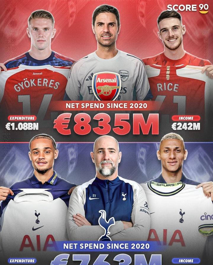 阿森纳与热刺五年引援投入相近,成绩却天壤之别:前者冲冠,后者濒临降级